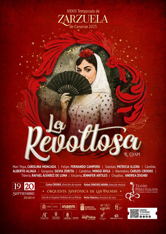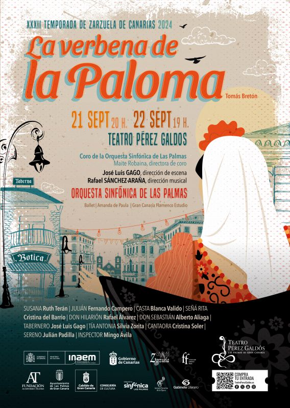 LA VERBENA DE LA PALOMA Ampliada con fragmentos de La Revoltosa Susana...Rosa Ruiz Julián...Cristóbal Viñas Señá Rita...Adelina Valido La Cantaora y Soledad...Laura de Pinto Casta...Ana Cristina Soage Don Hilarión...Miguel de Grandy Tía Antonia...Concha del Val Don Sebastián...Mario Rodrigo Tabernero...Gerardo Meré Inspector...Pepe Batista Sereno...Luis Bellido Moao 1º...David Mosquera Mozo 2º...Nauzet Valerón Coro del Festival de Zarzuela de Las Palmas de G.C. Ballet Español Danzalarriba Orquesta Sinfónica de Las Palmas Director Juan José Ocón